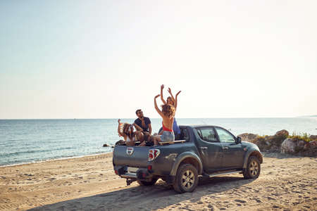 side view . friends sitting in the car and looking at the camera.