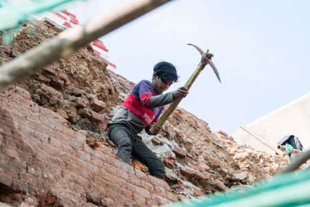 Unidentified man worker with pickaxe on construction site.