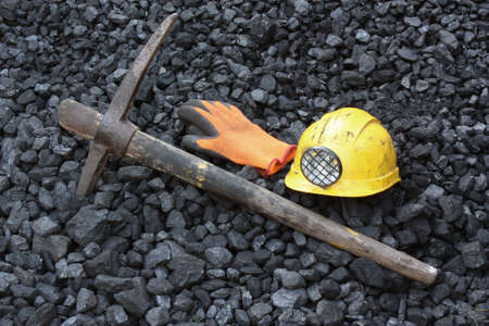 Pickaxe, gloves, mining helmet in the background heap of coal