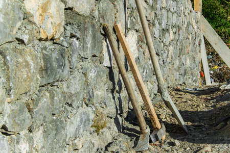 retro pickax on the rocks