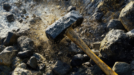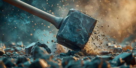 A high-energy scene depicting a hammer striking rock, creating dust and debris. This image captures the essence of manual labor in a rugged construction environment.