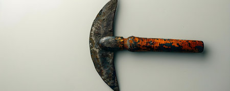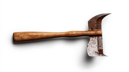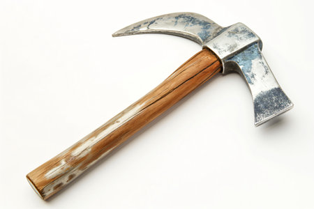 Weathered pickaxe with a wooden handle on a white background, showing its rustic charm and history. Perfect for industry and craftsmanship themes