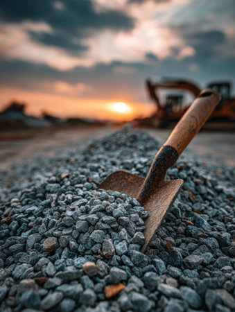 A large pile of gravel is accompanied by a shovel, set against a blurred backdrop of construction equipment under a vibrant sunset sky.