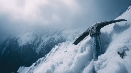 An ice ax is partially buried in the snow, highlighting a rugged mountain landscape shrouded in clouds, depicting the harshness of alpine conditions.