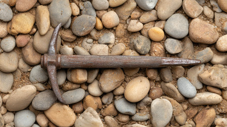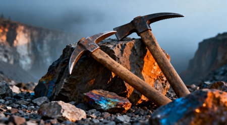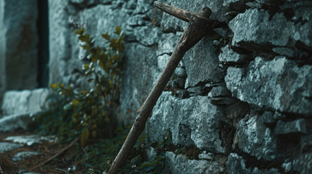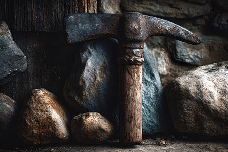 Old, rusty pickaxe with a wooden handle leans against a pile of rocks, possibly evoking themes of mining, geology, or historical tools in a dimly lit, atmospheric setting