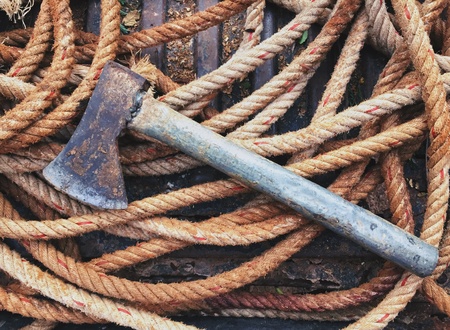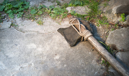 Closeup rough past archaic Neolith era craft Indian hunter man battle flint blade hemp hache arm wild ground nature text space. Close up top view repair tribe steel iron warfare object art style sign