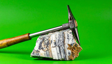 A geologists hammer rests on a freshly collected rock specimen, a symbol of discovery and scientific exploration. This image, set against a vibrant green screen for easy compositing, represents the foundational work of earth science, from fieldwork analysis to laboratory research.