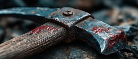 A weathered pickaxe rests on rugged stones showing signs of wear and red patches suggesting recent use in a mining or excavation task.
