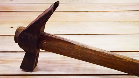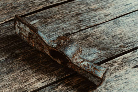 Old rusty hammer on wooden background.