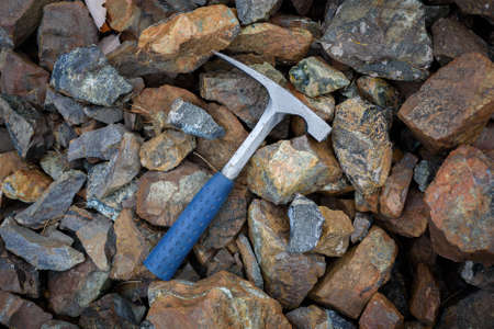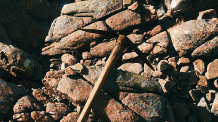 Chisel edge rock pick, geologist exploration tool over natural rocks background in abandoned chromite mine in Cyprus