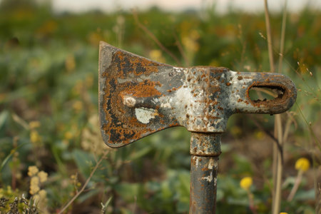 Rusty axe standing upright in the middle of a field, showing signs of age and use