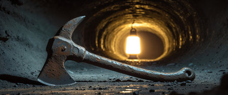 AI Generated. Rusty pickaxe in dimly lit underground mining tunnel with earthen walls