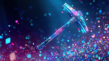 This dynamic image features a neon digital hammer set against an abstract backdrop of colorful particles, creating a mesmerizing visual effect.