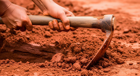 Close-up of a worker's hands firmly gripping a wooden hoe handle while digging into rich, red soil. The image represents manual labor, farming, gardening, construction, and working the land.
