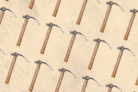 Diagonal mosaic of many wooden hoes on a textured pastel background. Gardening tools.