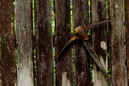 Aged Abandoned Pickaxe on the Ground Closeup Photo. Sepia Color Grading.