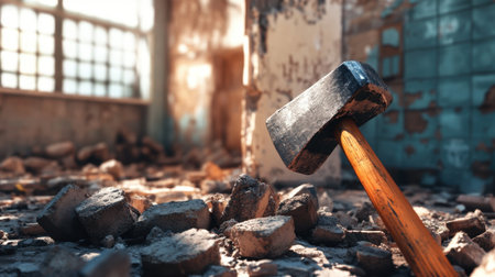 Sledgehammer leaning against a wall partially demolished, surrounded by rubble