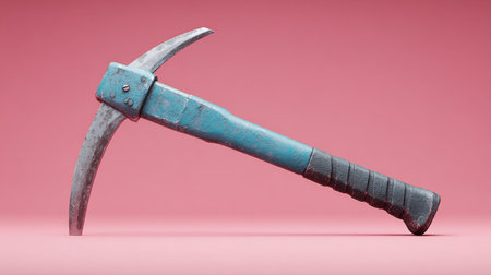 A blue pickaxe is shown on a pink background. The pickaxe is old and rusty, and it is a tool used for mining or breaking rocks. The pink background adds a sense of warmth and nostalgia to the image