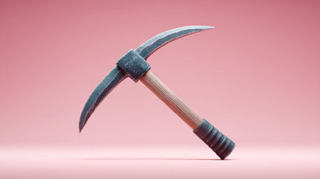 A pickaxe is shown on a pink background. The pickaxe is made of metal and wood, and it is pointed at an angle. The image has a somewhat ominous and foreboding mood