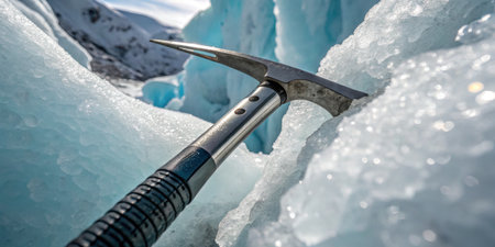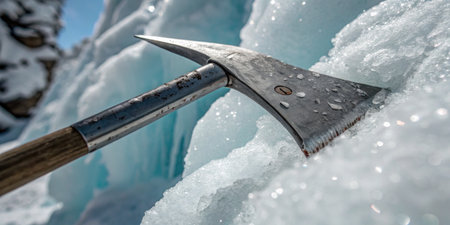 An ice axe lies on crystal glacier ice, highlighting the beauty of icy exploration.