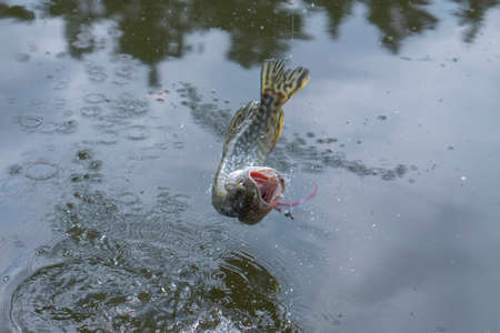 The fisherman is holding a fish pike caught on a hook in a freshwater pond.