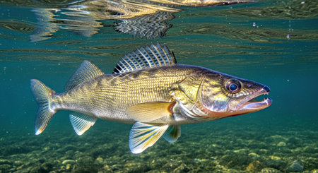 Walleye fish underwater with detailed scales and fins swimming in clear blue water with natural light and aquatic plants