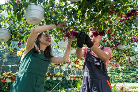 Young workers in a greenhouse feed flowers. The concept of caring for plants