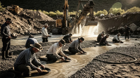 Men are shown panning for gold near heavy machinery in a natural setting. The image depicts individuals working in shallow water with dirt and gravel. Natural light illuminates the scene, highlighting textures. The picture is suitable for illustrating themes such as resource extraction and industrial processes.