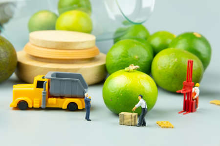 Miniature people workers moving green lemon for export. Concept of selecting, agricultural products best quality
