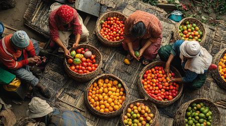 Aerial view of a group of people working on a farm. Top view.