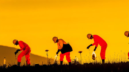 A group of volunteers working together to clean up and care for a picturesque autumn landscape with the warm glow of the setting sun illuminating the serene natural environment