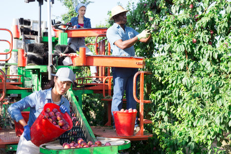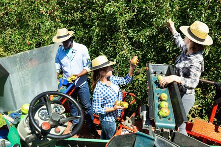 Concept of mechanization of fruit harvesting. Diligent cheerful smiling workers picking ripe pears in orchard on automatic harvesting platform