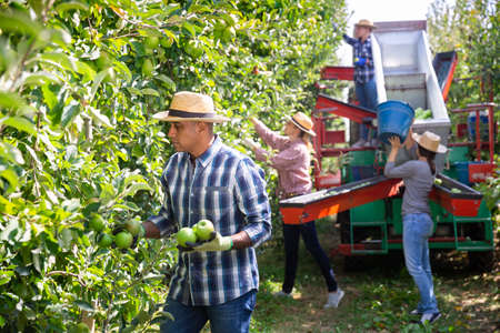 Gardeners team collecting fruits on big organic farmland enjoying process. Hardworking agronomical specialists doing research on countryside plantation. Agro business occupation teamwork concept