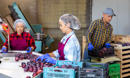 Female employee sorting harvested plums at fruit warehouse