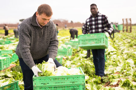 Male workers on the field stack lettuce in boxes