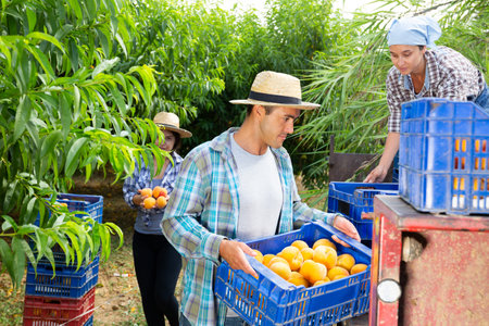 Workers carry boxes of peaches to the tractor platform