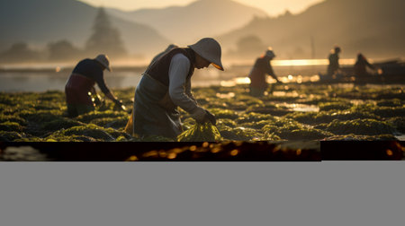Sustainable seaweed farming practices with a photo of farmers tending to seaweed crops in an eco-friendly ocean garden.
