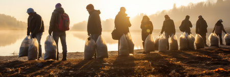 Volunteers cleaning garbage near water. People collecting trash at plastic bags at coast of river, pollution AI generative illustration.