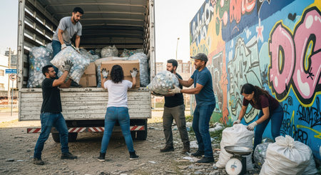 Community cleanup initiative with diverse group of adults loading recyclables into truck
