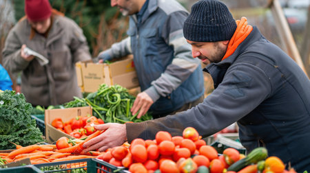 People sell and buy vegetables at the outdoor market