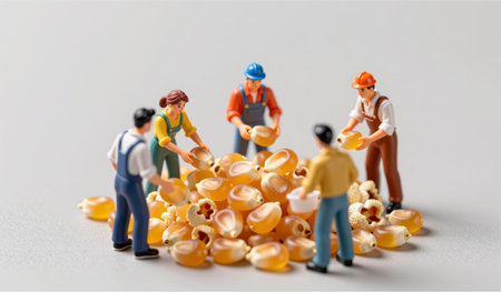 Five miniature figures gather around a large pile of popcorn kernels in a creative scene. They busy themselves selecting and sorting the kernels, showcasing a playful take on a popcorn harvest.