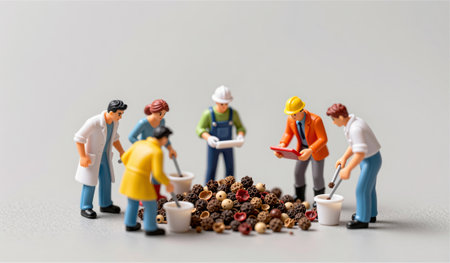 A group of six miniature figures is gathered around a large pile of various materials, each engaged in sorting and organizing. The playful scene showcases teamwork and cooperation.