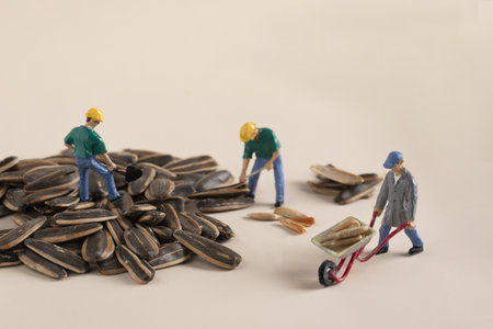 A closeup shot of mini construction worker figurines working on sunflower seeds