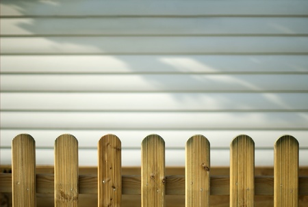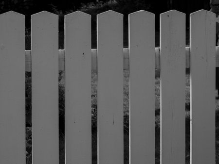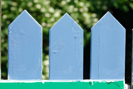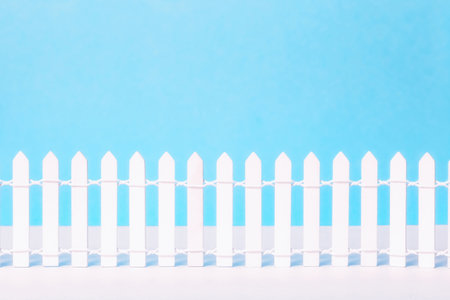Wooden vintage white picket fence on blue background. Small paint simply wood decorative rail fencing. New painted retro long timber barrier. Low rustic closed boundary design element, front view