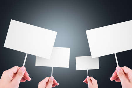 Multiple hands holding blank, white cardboards with copy space for design, on dark background.