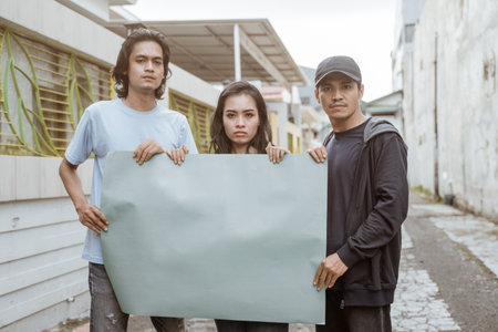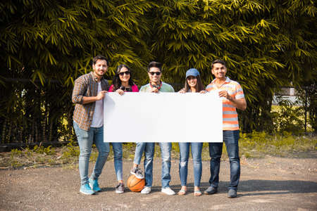 Asian Indian college students Holding or showing empty white board or placard in university campus, outdoor shot