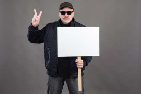 A man in black glasses with a poster in his hands. The man with the poster shows the victory sign with his fingers. Space for text. The person has achieved the fulfillment of their requirements.