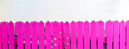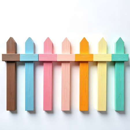 Colorful wooden fence with variety of hues including blue, green, yellow, and pink, surrounded by greenery, creating vibrant and cheerful atmosphere