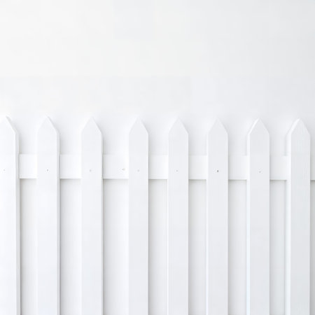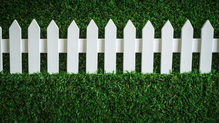 Close-up view of white picket fence slats above perfectly laid green artificial turf.
