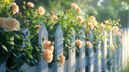 A charming rustic white wooden fence stands in a sunlit garden, surrounded by colorful wildflowers, evoking a serene countryside atmosphere.